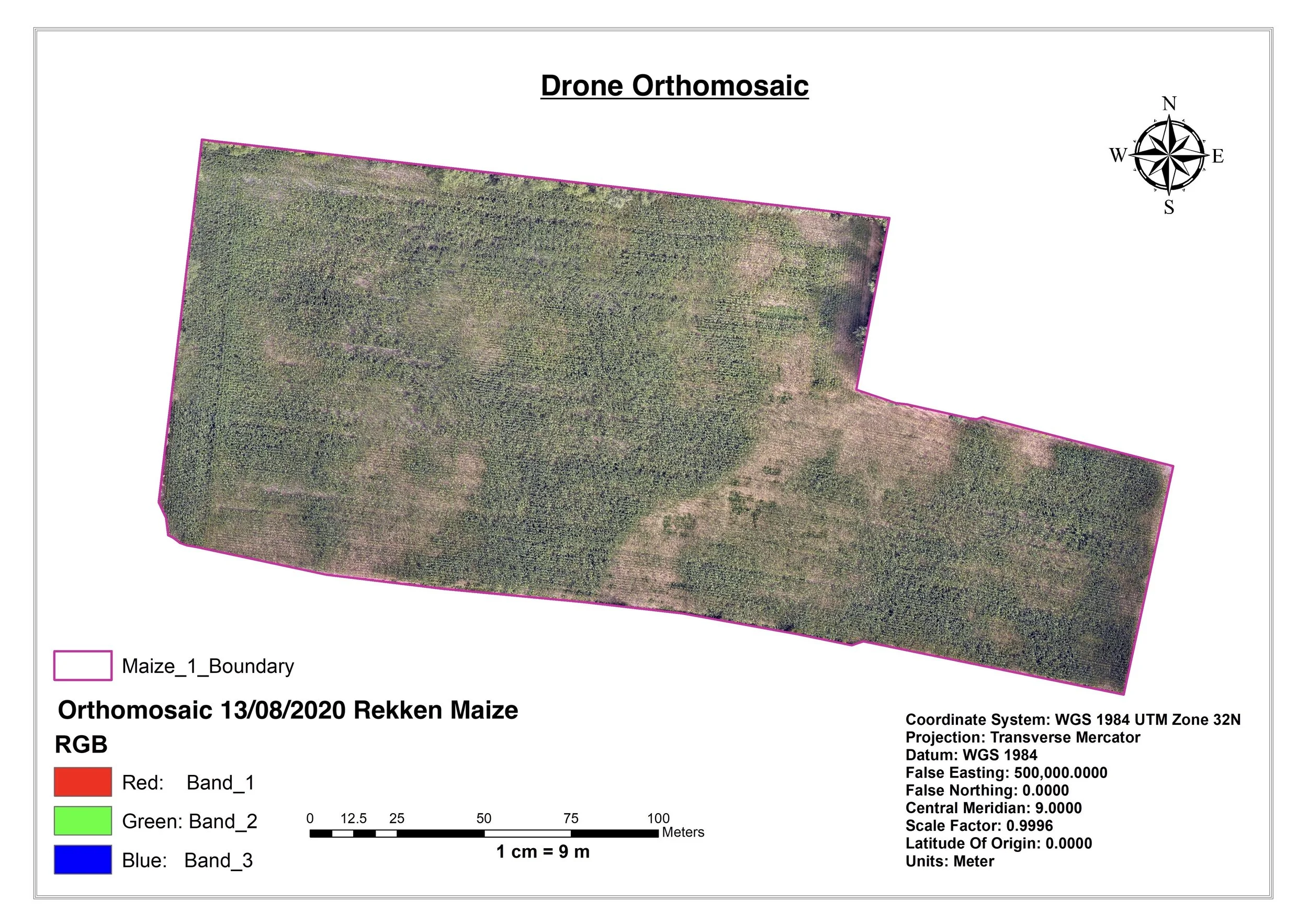 Below are the mosaics of the drone images acquired on 22 July 2020 in the AgriWatch test areas for visual interpretation because of the variable sky conditions. Weeds are coming back in Maize fields (easy to detect), but much improvement in soil compared to 2019 because of the clay added in the Maize field.